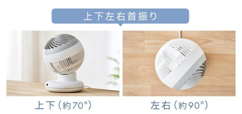 通常のサーキュレーターは左右のみの首振りが多く、風は横方向にしか広がりません。一方、このモデルは上下にも動くため、縦と横の両方向に風を送り、空間全体を立体的に循環させます。
