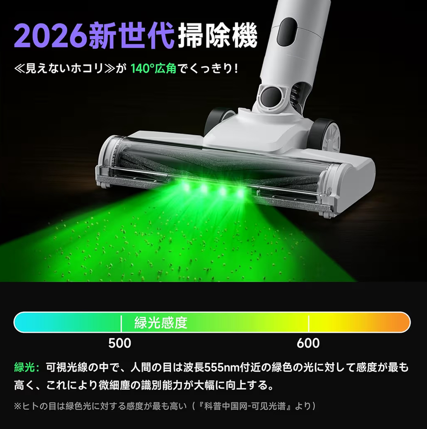 加えて、視感度最適グリーンLEDの搭載により、肉眼では見えにくい微細なホコリまで浮かび上がります。掃除をした“つもり”ではなく、「ここまでキレイになった」と目で確認できる安心感は、掃除への満足度を大きく高めてくれます。