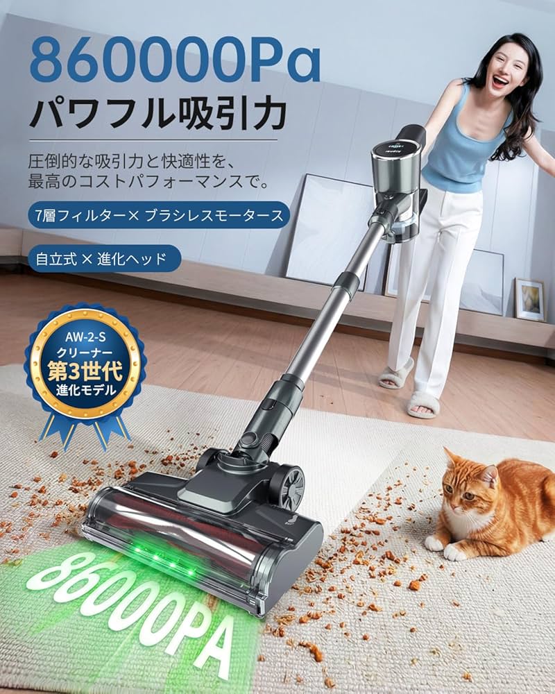 Airpherコードレス掃除機が注目される最大の理由は、86kPaという圧倒的な吸引力です。