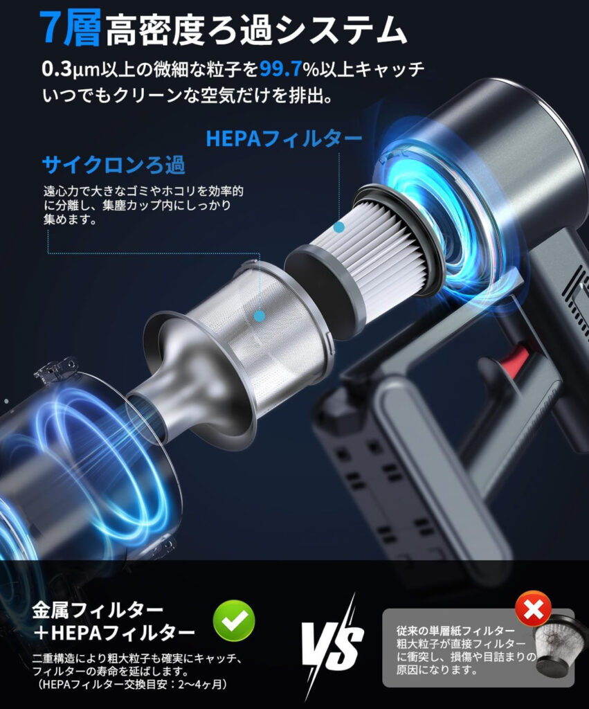 搭載されているのは、7重濾過システムとHEPAフィルター