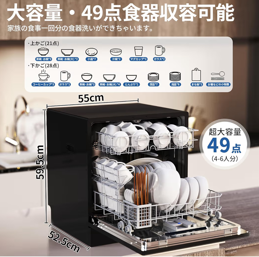 49点の食器を一度に洗える大容量設計に加え、熱風送風乾燥とオートオープン機能によって、洗浄から乾燥までしっかりサポート。賃貸住宅でも導入しやすく、忙しい家庭の家事負担を大きく軽減してくれます。